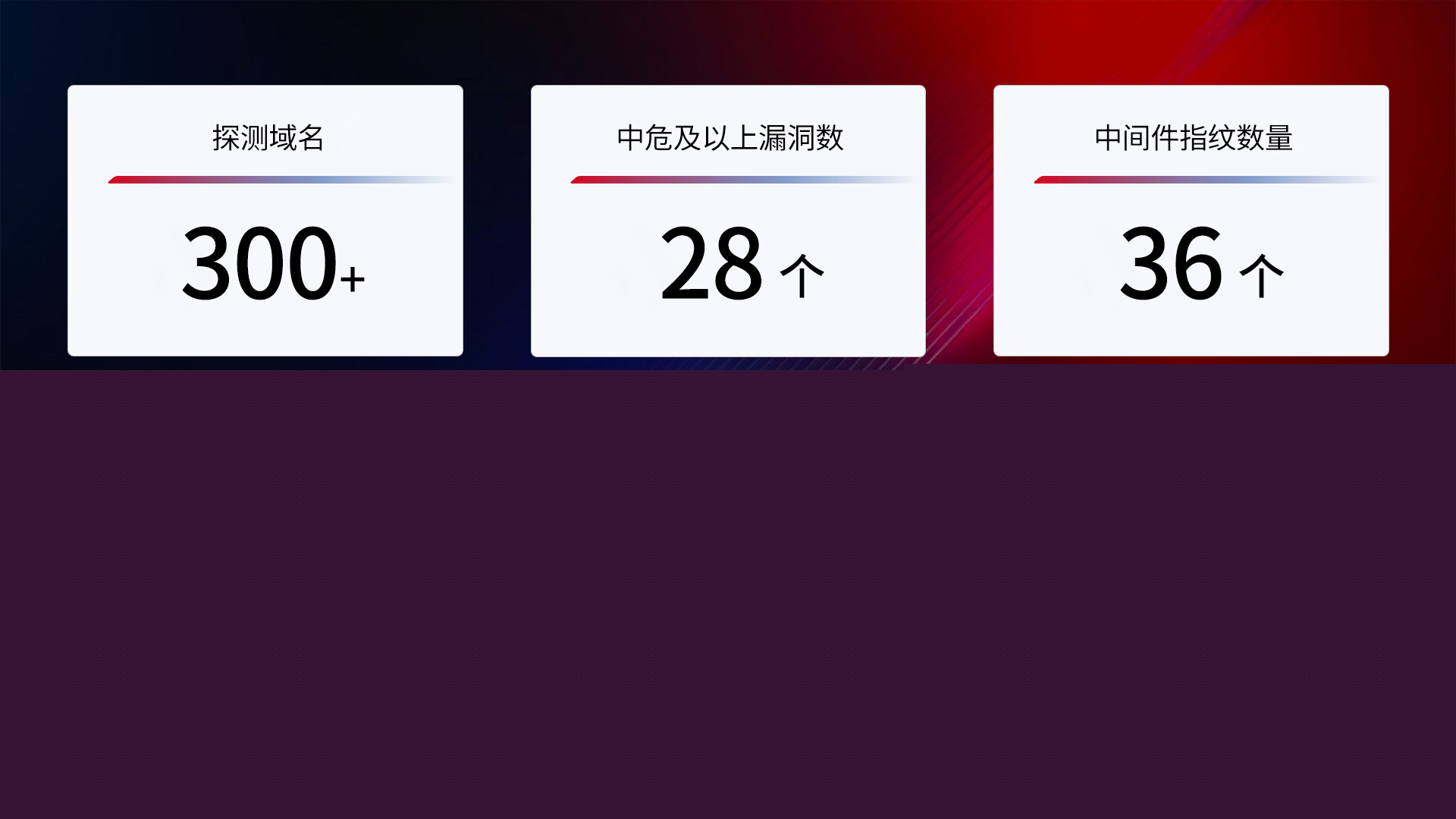 通过专业化成熟的安全服务团队和工具,对组织的互联网资产、应用、端口暴露面进行全面梳理,精准识别运行在资产上的中间件和应用情况。